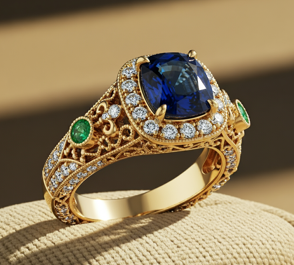 Queen Ring available in 20Karat, 18Karat, 14Karat, 10 Karat with genuine Blue Sapphire, Diamonds, Emerald. Limited Edition